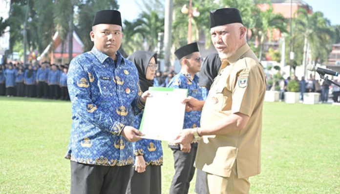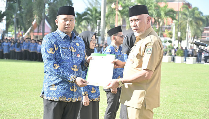 padangtime.com – Suasana halaman Kantor Gubernur Sumatera Barat terasa hangat dan penuh haru pada Selasa (27/5/2025). Gubernur Mahyeldi Ansharullah secara langsung menyerahkan Surat Keputusan (SK) pengangkatan kepada 1.475 orang yang berhasil lolos seleksi Calon Pegawai Negeri Sipil (CPNS) dan Pegawai Pemerintah dengan Perjanjian Kerja (PPPK) tahap pertama tahun 2024.