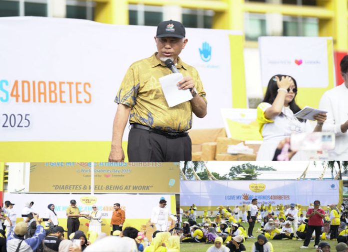 padangtime.com – Gubernur Sumatera Barat, Mahyeldi Ansharullah, membuka kegiatan Senam Sehat dalam rangka World Diabetes Day 2025 di halaman Kantor Gubernur Sumbar, Minggu (16/11/2025). Acara bertema I Give My HANDS4DIABETES yang digelar Tropicana Slim ini menjadi bagian dari kampanye nasional untuk mengajak masyarakat lebih peduli pada kesehatan dan pencegahan diabetes sejak dini.
