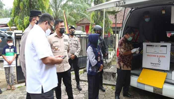 Bupati Dharmasraya, Kajari Darmasraya beserta Kapolres Dharmasraya turut menyambut kedatangan 3.000 Vaksin Sinovac di gudang penyimpanan farmasi Dharmasraya dan menyaksikan langsung proses penyimpanan vaksin sesuai SOP yang ada.