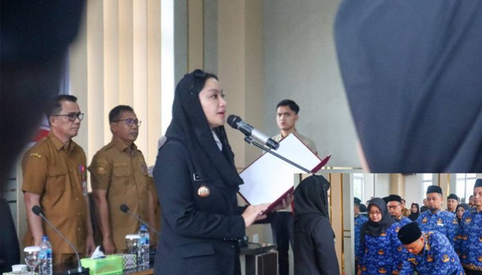 Dharmasraya – Sebanyak 35 pejabat administrator dan pengawas di lingkungan Pemerintah Kabupaten Dharmasraya resmi dilantik dan diambil sumpah jabatannya oleh Bupati Dharmasraya, Annisa Suci Ramadhani, di Pulau Punjung, Selasa (7/10/2025).