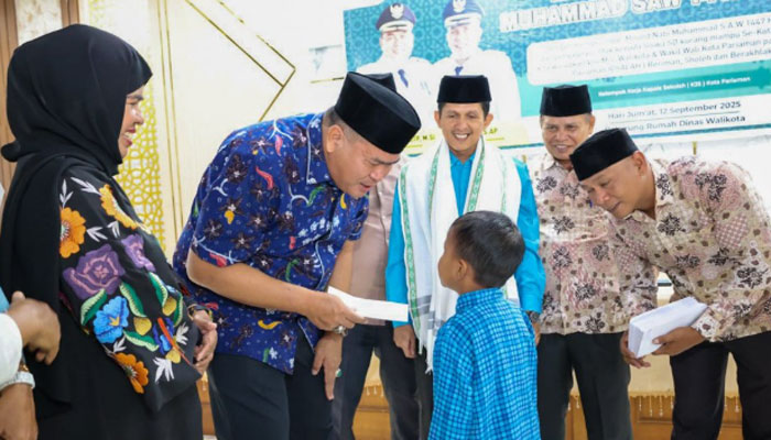padangtime.com – Wali Kota Pariaman, Yota Balad menyerahkan infaq dari Guru dan Tenaga Kependidikan (GTK) kepada 80 orang murid Sekolah Dasar (SD) se Kota Pariaman di Balairung Pendopo Walikota Pariaman, Jum’at (12/9).