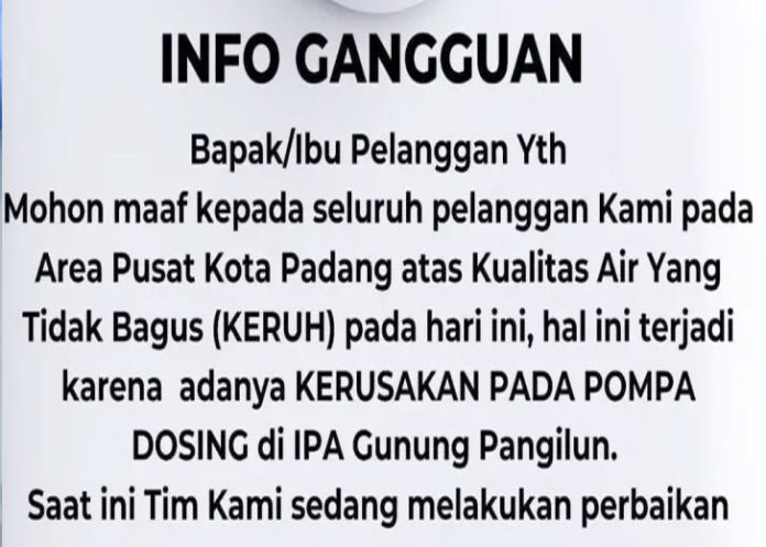 Gangguan tersebut terjadi akibat kerusakan pompa dosing di Instalasi Pengolahan Air Gunung Pangilun yang menjadi salah satu fasilitas utama pengolahan air bersih di kota tersebut.