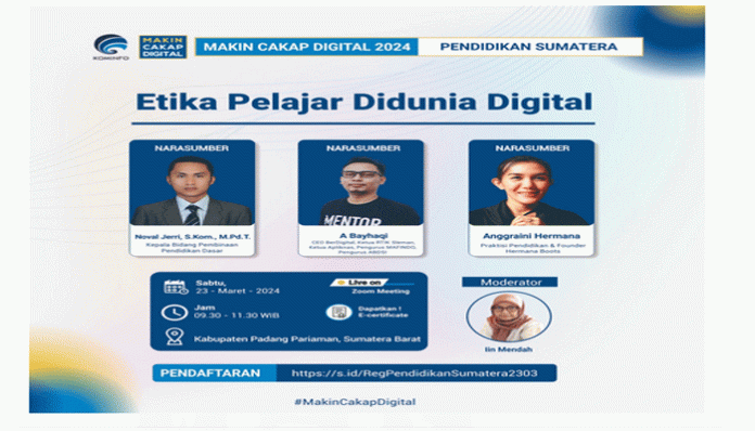 Untuk mendorong penerapan etika digital di kalangan pelajar, Kementerian Komunikasi dan Informatika (Kemenkominfo) bersama Dinas Pendidikan dan Kebudayaan Provinsi Sumatera Barat, akan menggelar webinar literasi digital untuk segmen pendidikan, Sabtu (23/3) pagi, pukul 09.30 WIB. Kegiatan ini akan diikuti oleh kalangan pendidik dan pelajar dengan menggelar nonton bareng (nobar) di sejumlah sekolah di Kabupaten Padang Pariaman.