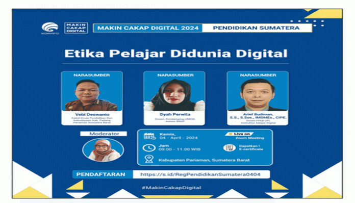 Padang TIME.com – PADANG PARIAMAN – Untuk meningkatkan pemahaman ihwal pentingnya etika digital di dunia maya, Kementerian Komunikasi dan Informatika (Kemenkominfo) RI bersama Kantor Dinas Pendidikan dan Kebudayaan Provinsi Sumatera Barat akan menggelar webinar literasi digital untuk segmen pendidikan di Kabupaten Padang Pariaman, Sumbar, Kamis (4/4) pagi, pukul 09.00 WIB.