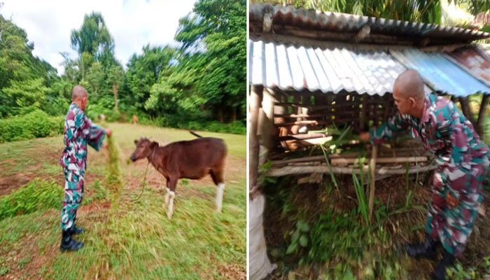 Babinsa Koramil 03 Sipora Utara Serda Yonedi lakukan monitoring peternakan sapi milik warga (Rio) 38 tahun di Desa binaan di Desa Tua Pejat Kab Kep Mentawai untuk sebagai upaya mengantisipasi dan mencegah Penyakit Mulut dan Kuku (PMK).
