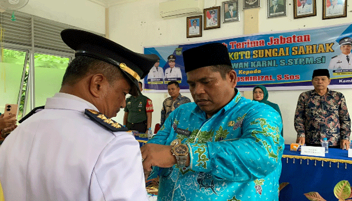 Padang TIME | Bupati Padang Pariaman Suhatri Bur menghadiri acara serah terima jabatan (sertijab) Camat VII Koto dari Plt. Camat Mirwan Karni kepada camat definitif Yusri Rizal. Acara berlangsung di Aula Kantor Camat VII Koto Sungai Sariak, pada Kamis (04/01).