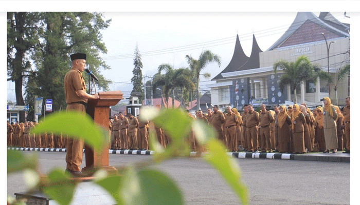 Bupati Pasaman Sabar AS saat memimpin apel tersebut dalam amanatnya menyampaikan Ucapan Selamat Idul fitri kepada seluruh ASN dan non ASN pada apel organik.