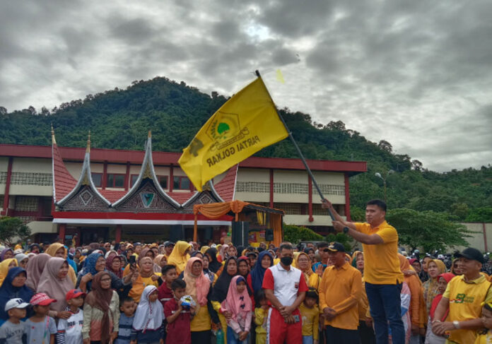 PadangTIME.com | Bupati Kabupaten Pesisir Selatan, Rusma Yul Anwar menghadiri acara jalan sehat dalam rangka memeriahkan Hari Ulang Tahun (HUT) Partai Golongan Karya (Golkar) ke – 58, di daerah itu, Minggu (16/10).