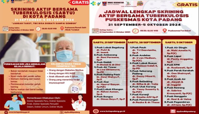 Selanjutnya, skrining TBC Sabtu (28/9/2024) pekan depan, digelar di Puskesmas Pauh, Andalas, Lubuk Buaya, Seberang Padang, Belimbing, Ulak Karang, Kuranji, Pemancungan.