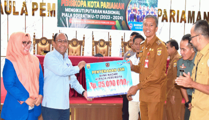 PadangTIME.com | Bank Nagari menyerahkan Bantuan kepada Persatuan Sepakbola Kota Pariaman (Persikopa) sebagai bentuk kepedulian dalam membangun dan memajukan dunia olahraga, terutama sepakbola.