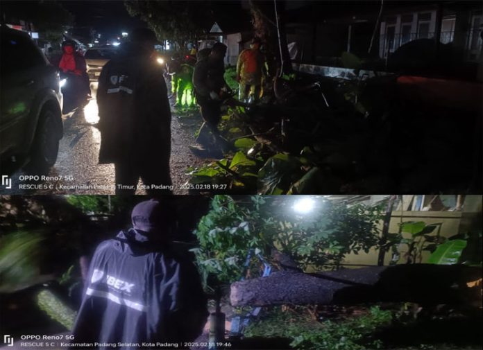 padangtime.com | Cuaca ekstrem berupa hujan deras disertai angin kencang yang melanda sejumlah wilayah Kota Padang, Selasa (18/2/2025) malam WIB mengakibatkan terjadinya pohon tumbang di beberapa titik.