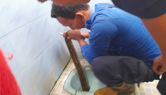 Padang TIME – Seekor ular jenis piton sepanjang 2 meter dievakuasi dari dalam closet Toko Emas Makmur di Kawasan Pasar Kota Payakumbuh, sekitar pukul 09.30 WIB, Rabu (1/6).