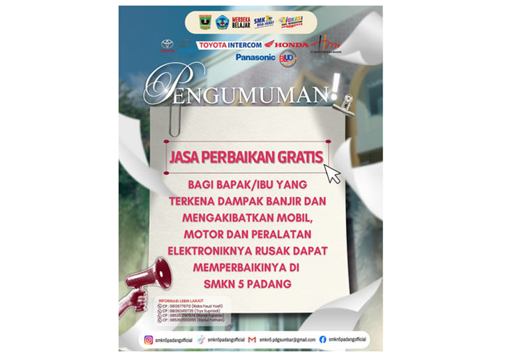 padangtime.com – Dinas Pendidikan Provinsi Sumatera Barat (Sumbar) melalui SMKN 5 Padang membuka layanan jasa perbaikan gratis bagi masyarakat yang terdampak bencana banjir yang melanda sejumlah wilayah di Kota Padang dan sekitarnya. Jenis layanan yang diberikan mulai dari perbaikan kendaraan roda empat , roda dua dan berbagai peralatan elektronik.