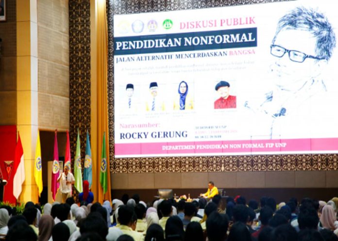 Diskusi publik tersebut menghadirkan filsuf dan akademisi Rocky Gerung yang dikenal dengan pemikiran kritisnya. Dalam sambutannya, Rektor UNP Ir. Krismadinata, Ph.D., menyebut Rocky Gerung sebagai “tamu yang berbahaya” karena membawa “segudang amunisi logika”. Ia juga mengutip filosofi Minangkabau alam takambang jadi guru, yang menegaskan bahwa setiap orang adalah guru dan setiap tempat merupakan ruang belajar.