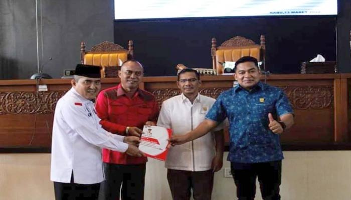 DPRD Ir. H. Adi Gunawan, MM dan Ade Sudarman, S.Pd, menyampaikan LKPJ diwakali oleh Sekretaris Daerah Adlisman, Rabu (13/4/2024).