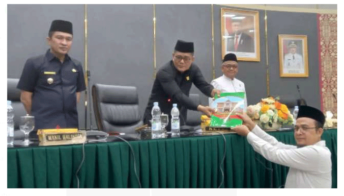 Setelah laporan diserahkan Sekwan, maka Ketua DPRD Kota Padang didampingi oleh Wakil Ketua Arnedi Yarmen menyerahkan dokumen tersebut kepada Wakil Walikota Padang.