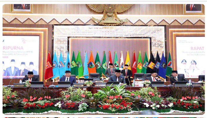PadangTIME.com – DPRD Provinsi Sumatera Barat menggelar rapat paripurna mendengarkan pidato kenegaraan untuk memperingati Hari Ulang Tahun (HUT) ke-79 Republik Indonesia tahun 2024 melalui siaran langsung di media televisi, di ruang rapat utama DPRD Provinsi Sumbar, Jumat, 16 Agustus 2024.