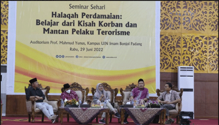 PadangTIME.com – Fakultas Sains dan Teknologi UIN Imam Bonjol Padang bersama Aliansi Indonesia Damai (AIDA) dan Lasigo Akademia Indonesia adakan seminar sehari dengan tajuk “Halaqah Perdamaian : Belajar dari kisah korban dan mantan pelaku Terorisme” di Auditorium Mahmud Yunus kampus II UIN Imam Bonjol Padang, Rabu 29 Juni 2022.