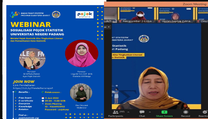 Webinar menghadirkan 2 orang pemateri yaitu Sri Miftahul Rahmi sebagai agen pojok statistik yang berasal dari mahasiswa prodi Statistika (D3) dan Ibu Lidya Sri Yeni, S.ST, M.Si yang berasal dari statistika ahli madya BPS Prov Sumbar. Sri Miftahul Rahmi menjelaskan tentang bagaimana pojok statistik yang berada di gedung perpustakaan UNP lantai 2 bekerja dan melayani mahasiswa UNP dalam hal penyediaan data statistic yang dihimpun oleh BPS dan juga hingga ke konsultasi statistik. Sri juga menjelaskan teknik pembuatan akun untuk dapat mengakses perpustakaan BPS. Sedangkan Bu Lidya menjelaskan tentang kegiatan-kegiatan dan layanan-layanan yang diadakan oleh BPS yang dapat diikuti dan dinikmati oleh seluruh pengguna data khususnya kalangan akademik perguruan tinggi termasuk mahasiswa.