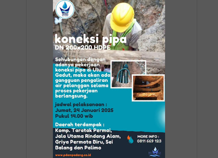 padangtime.com | Kami informasikan bahwa akan ada gangguan pengaliran air terkait pekerjaan Koneksi Pipa DN 200×200 HDPE di Ulu Gadut. Pekerjaan ini dijadwalkan akan berlangsung pada Jumat, 24 Januari 2025, mulai pukul 14.00 WIB.