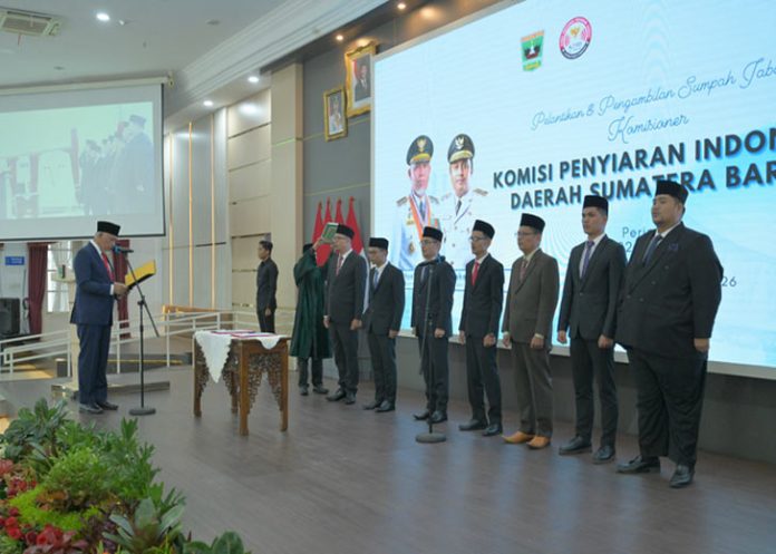 padangtime.com – Gubernur Sumatera Barat (Sumbar), Mahyeldi Ansharullah melantik tujuh Komisioner Komisi Penyiaran Indonesia Daerah (KPID) Provinsi Sumatera Barat periode 2026–2029 di Auditorium Gubernuran, Senin (16/3/2026). Pelantikan tersebut berlangsung khidmat dan dihadiri unsur Forkopimda, pejabat Pemerintah Provinsi Sumbar, serta tamu undangan lainnya.
