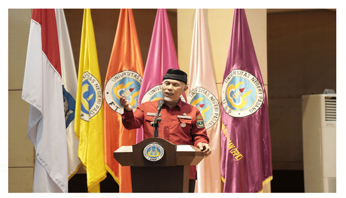“Rekan-rekan mahasiswa memiliki tugas dan tanggung jawab untuk menjadi pemimpin di masa depan, yang bertepatan dengan perwujudan visi Indonesia Emas pada tahun 2024. Oleh karena itu, rekan-rekan sekalian perlu perbekalan yang cukup untuk menjadi seorang pemimpin,” ucap Gubernur dalam arahannya di Auditorium UNP.