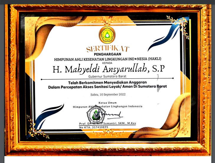 PadangTIME.com– Gubernur Sumatera Barat, Buya Mahyeldi, menerima penghargaan dari Himpunan Ahli Kesehatan Lingkungan Indonesia (HAKLI) atas komitmen penyediaan anggaran dalam percepatan akses sanitasi layak/aman di Sumatera Barat (Sumbar).