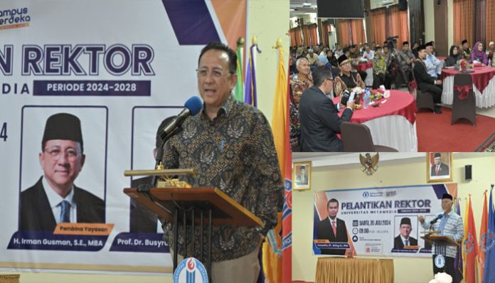 PADANGTIME.COM | Mahyeldi Ansharullah turut menyaksikan prosesi pelantikan Yossyafra sebagai Rektor Universitas Metamedi, Sabtu (20/7/2024). Kepemimpinan baru, diyakini Gubernur akan semakin menguatkan peran universitas tersebut dalam menjawab tantangan zaman, terkhusus di bidang teknologi informasi dan komunikasi.