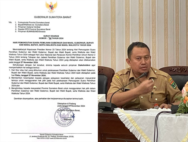Kepala Biro Administrasi Pimpinan (Kabiro Adpim) Setdaprov Sumbar, Mursalim menjelaskan isi dari SE Gubernur tersebut, secara garis besar ada 3 poin. Pertama, Gubernur mengingatkan bahwa tanggal 27 November 2024 telah ditetapkan pemerintah sebagai hari libur nasional karena bertepatan dengan hari pemungutan suara Pilkada serentak tahun 2024.