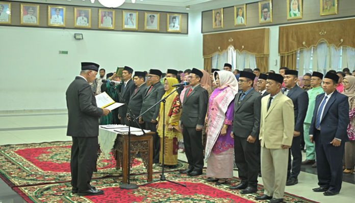 PADANGTIME.COM | Gubernur Sumatera Barat (Sumbar), Mahyeldi Ansharullah melantik dan mengambil sumpah jabatan 18 pejabat orang pejabat Administrator dan Pejabat Pengawas di Lingkungan Pemprov Sumbar, Kamis (15/8/2024) di Auditorium Gubernuran Sumbar.