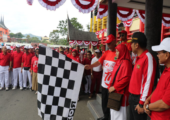 Gubernur Sumatera Barat (Sumbar) Buya Mahyeldi melepas ratusan peserta jalan sehat peringatan HUT RI ke-77 tingkat Provinsi Sumatera Barat, di halaman Kantor Gubernur Sumbar, Rabu (10/8/2022).