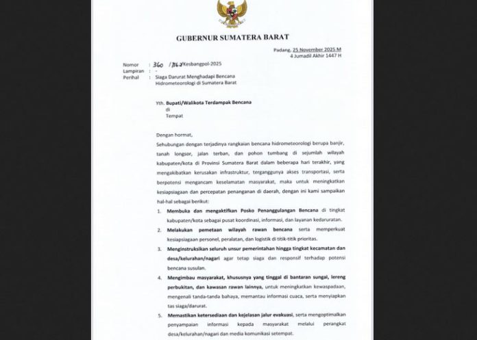 padangtime.com – Usai penetapan status tanggap darurat bencana alam, Pemerintah Provinsi Sumatera Barat (Pemprov Sumbar) perkuat upaya kesiapsiagaan dan percepatan penanganan dampak bencana alam di sejumlah wilayah terdampak dengan mengeluarkan Surat Gubernur nomor : 360/756.2/Kesbangpol/2025 tentang Siaga Darurat Menghadapi Bencana Hidrometeorologi di Sumbar. Surat tersebut, ditujukan kepada seluruh Bupati/Walikota daerah terdampak.