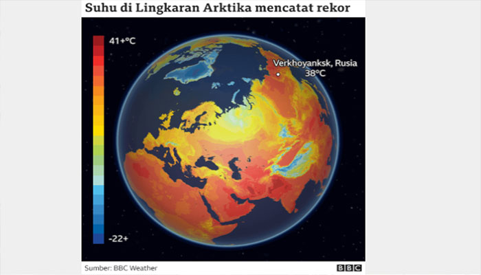 Catatan mengenai temperatur di Lingkar Arktika masih harus diverifikasi, namun tampaknya 18 derajat celsius lebih tinggi ketimbang suhu rata-rata maksimum harian pada Juni Cuaca panas pada musim panas bukan sesuatu yang jarang terjadi di Lingkar Arktika, namun suhu dalam beberapa bulan terakhir mencapai angka yang tinggi secara abnormal.