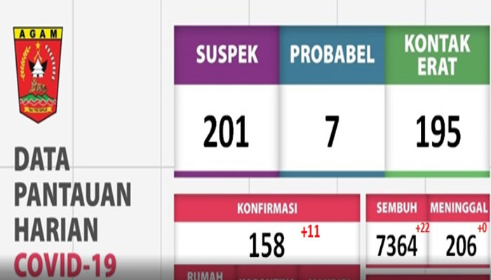 Ditambahkan, hingga Jumat ini, total akumulasi kasus pandemic covid-19 di kabupaten Agam sudah mencapai 7.728 kasus, dengan rincian 7.364 orang sudah dinyatakan sembuh, 206 orang meninggal dunia dan 158 kasus aktif.