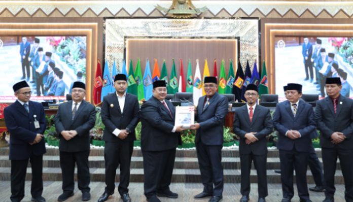 Penyerahan LHP BPK RI oleh Auditor Utama Keuangan Negara V BPK RI Dr. Slamet Kurniawan kepada Ketua DPRD Provinsi Sumatera Barat Supardi dan Wakil Gubernur Sumatera Barat Audy Jonaldy.