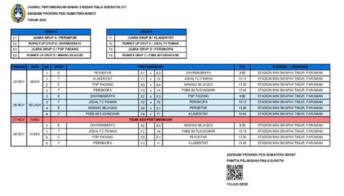 Kota Pariaman — Babak Penyisihan Piala Soeratin U-17 Sumatera Barat telah selesai, besok tepatnya hari Senin, tanggal 25 November 2024, akan dimulai Babak 8 Besar, dimana ada 8 (delapan) Tim yang telah lolos.