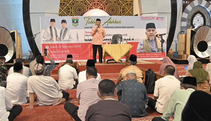 “Sebagaimana kita tahu, November nanti kita akan mengikuti pesta demokrasi Pemilu Kepala Daerah (Pilkada). Hal yang perlu kita pastikan adalah ikut berpartisipasi menyalurkan hak pilih. Sehingga, partisipasi Pemilu di Sumbar dapat lebih baik lagi,” ujar Mahyeldi di hadapan jemaah yang terdiri dari ASN dan karyawan di lingkup Pemprov Sumbar dan Karyawan Instansi Vertikal, BUMN, dan BUMD.