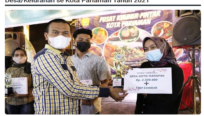 Padang TIME.com – Desa Koto Marapak, Kecamatan Pariaman Timur Kota Pariaman menjadi Juara Pertama pada Lomba Video Kreatif antar Desa/Kelurahan se Kota Pariaman Tahun 2021 yang digagas oleh Dinas Pariwisata dan Kebudayaan (Disparbud) Kota Pariaman.