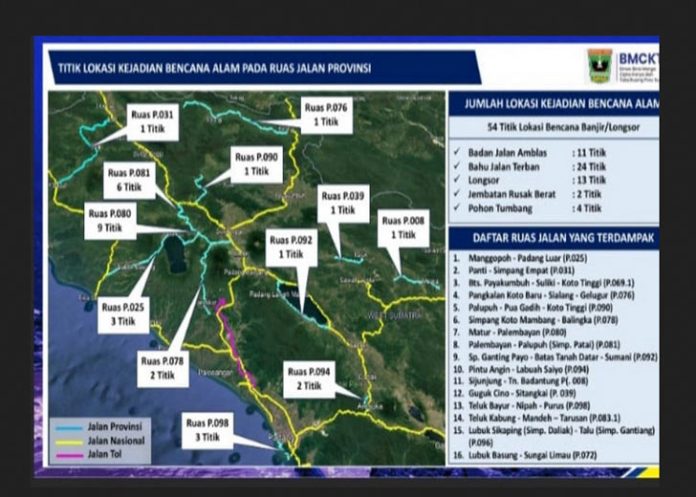 Kepala Bidang Bina Marga, Dinas BMCKTR Sumbar, Adratus Setiawan menyebut saat ini pihaknya masih melakukaan pendataan di lapangan. Berdasarkan data sementara jumlah ruas jalan provinsi yang terdampak ada 16 ruas dengan 54 titik permasalahan.