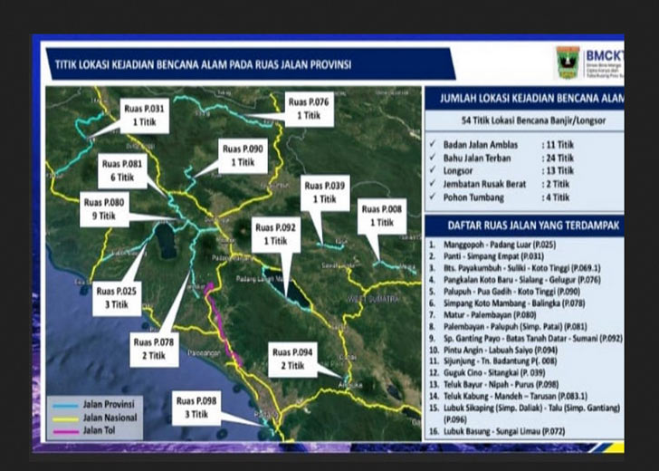 Ia menerangkan, berdasarkan hasil pemetaan timnya di lapangan, total ruas jalan provinsi yang terdampak sebanyak 16 ruas jalan. Sedangkan titik yang bermasalah, terdeteksi sebanyak 54 titik.
