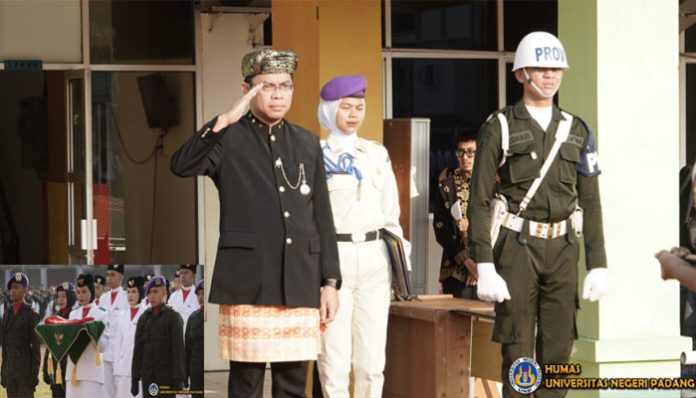 PADANGTIME.COM | Universitas Negeri Padang (UNP) menggelar upacara peringatan Hari Ulang Tahun Republik Indonesia ke-79 pada Sabtu (17/8/2024). Upacara yang berlangsung di lapangan atletik UNP tersebut dipimpin langsung oleh Rektor UNP, Krismadinata.