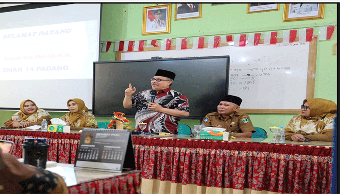 PadangTIME.com – Ketua DPRD Sumatera Barat, Muhidi, menegaskan komitmennya dalam memperkuat budaya literasi di sekolah sebagai langkah strategis menekan angka kenakalan remaja. Hal itu disampaikannya saat berdialog dengan para guru SMA Negeri 14 Padang, Senin (12/1), dalam rangka penyerahan bantuan baju batik.