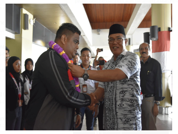 Ketua DPRD Sumbar Supardi saat menyambut para atlet didampingi oleh Kepada Dinas Pemuda dan Olahraga (Kadispora) Sumbar Dedi Diantolani serta jajaran pengurus IPSI Sumbar salah satunya Ismunandi Syofyan.