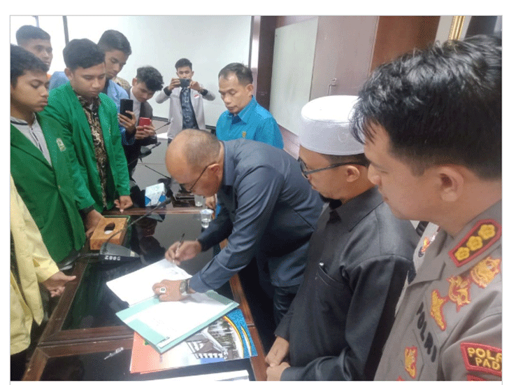 Usai melakukan audiensi, ketua DPRD Sumbar Supardi bersama mahasiswa melakukan penandatanganan penyerahan tuntutan, untuk ditindak lanjuti DPRD Sumbar.