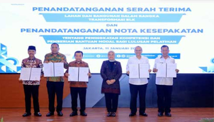 Penandatangan naskah perjanjian hibah dilakukan oleh Bupati dan Dirjen Bina Lavotas Budi Hartawan disaksikan Mennaker RI, Ida Fauziyah Rabu (11/1/2023).