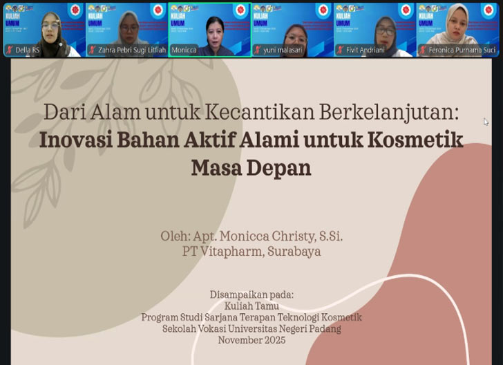 padangtime.com – Program Studi Teknologi Kosmetik, Sekolah Vokasi, Universitas Negeri Padang (UNP) mengadakan kuliah umum bertajuk “Dari Alam untuk Kecantikan Berkelanjutan: Inovasi Bahan Aktif Alami untuk Kosmetik Masa Depan” secara berani melalui Zoom Meeting, Senin (3/11). Kegiatan ini menghadirkan narasumber dari PT. Vitapharm (Viva Kosmetik), yaitu apt. Monicca Christy, S.Si, yang menjabat sebagai Manajer R&D di perusahaan tersebut.