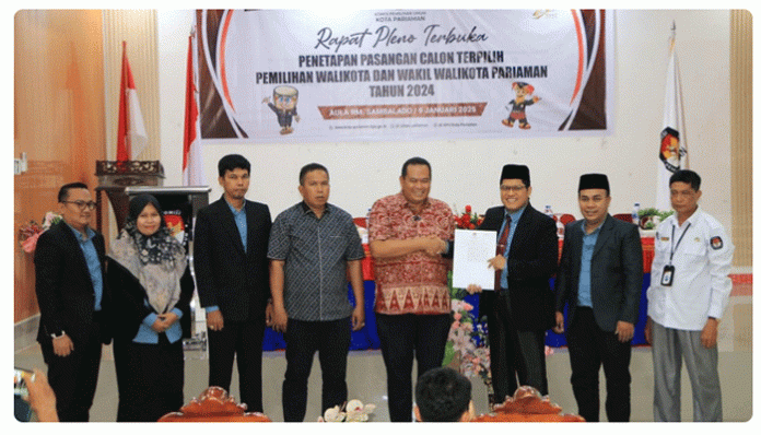 Padang Time.com – Komisi Pemilihan Umum (KPU) Kota Pariaman menetapkan pasangan Yota Balad – Mulyadi resmi menjadi Walikota dan Wakil Walikota Pariaman terpilih untuk periode 2025 – 2030. Berita acara penetapan dibacakan langsung oleh Ketua KPU Kota Pariaman, Ali Unan didampingi komisaris KPU lainnya, pada rapat pleno terbuka KPU Kota Pariaman di Aula Rumah Makan Sambalado, Desa Kuraitaji, Kecamatan Pariaman Selatan, Kota Pariaman, Kamis siang (9/1).
