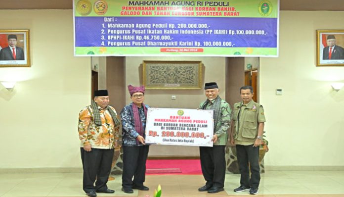 “Kemudian, ada bantuan dari PP Pengurus Pusat Ikatan Hakim Indonesia (IKAHI) senilai Rp100 juta yang diserahkan kepada PD IKAHI Sumbar, serta bantuan sebesar Rp100 juta dari Pengurus Pusat Dharmayukti Karini. Bantuan ini tentu saja bentuk belasungkawa kita atas bencana yang merenggut banyak nyawa dan mengakibatkan rusaknya infrastruktur di Sumbar,” ujar Syarifuddin.