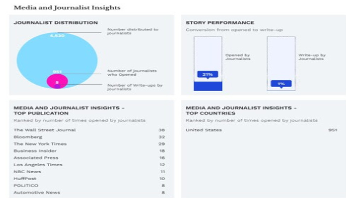 Media dan Wawasan Jurnalis milik Media OutReach Newswire memungkinkan klien memantau interaksi jurnalis dengan siaran pers mereka dengan rincian distribusi terperinci, tarif buka email, dan tarif buka berdasarkan publikasi. Hal ini memberi klien alat yang ampuh untuk perencanaan komunikasi strategis dan pengambilan keputusan strategis yang terinformasi dengan wawasan PR yang holistik. Laporan pasca-rilis yang siap digunakan ini memungkinkan para profesional komunikasi membuat laporan intelijen dalam bahasa Inggris dan Cina Sederhana untuk pelaporan C-Suite.