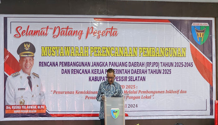 Pesisir Selatan – Musrembang Rencana Pembangunan Jangka Panjang Daerah (RPJPD) dan rencana kerja pemerintah daerah tahun 2025 resmi dibuka Bupati Pesisir Selatan, Rusma Yul Anwar, pada Kamis (4/4/2024) di Aula Bappeda Litbang Pessel di Sago.